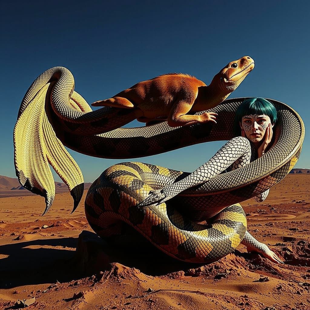 This image depicts a fantastical chimera with elements of a lion, goat, and snake, set against a surreal backdrop of contrasting colors and symbolic imagery, rendered with hyper-realistic detail.