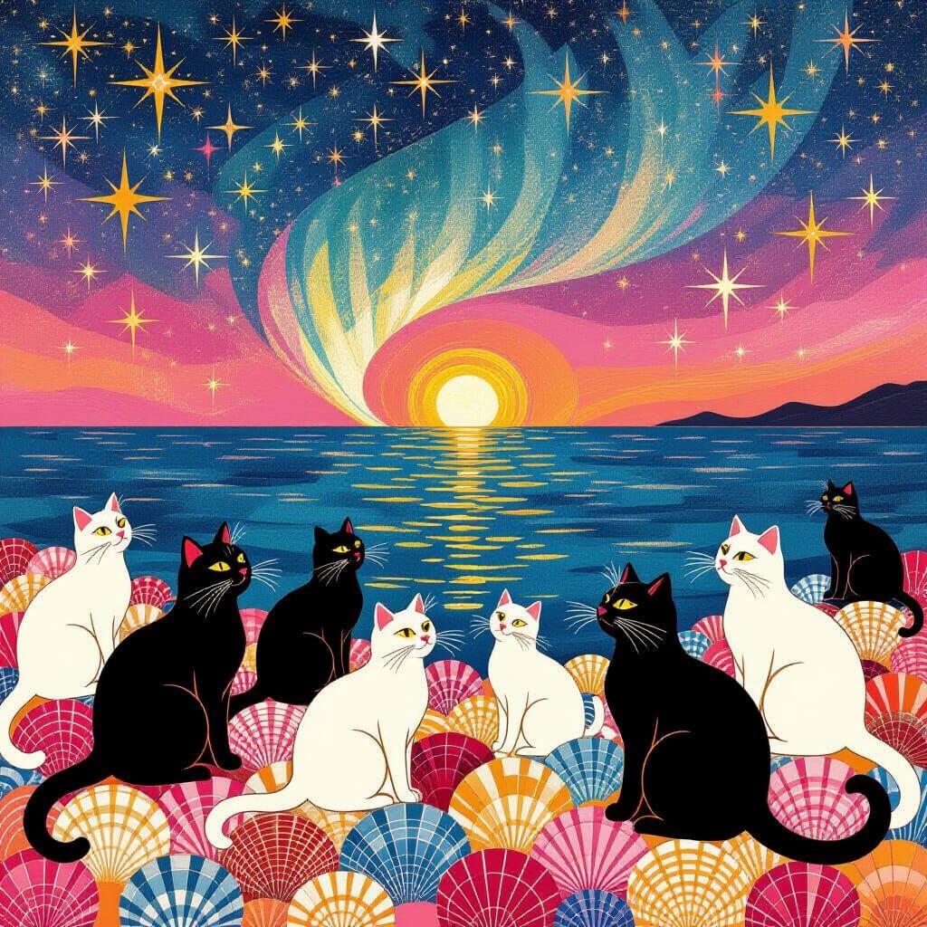 This image shows vibrant cats nestled in colorful shells, set against a deep sea illuminated by pink and lilac aurora borealis and golden stars. Features elaborate, gilded details in the style of Klimt.