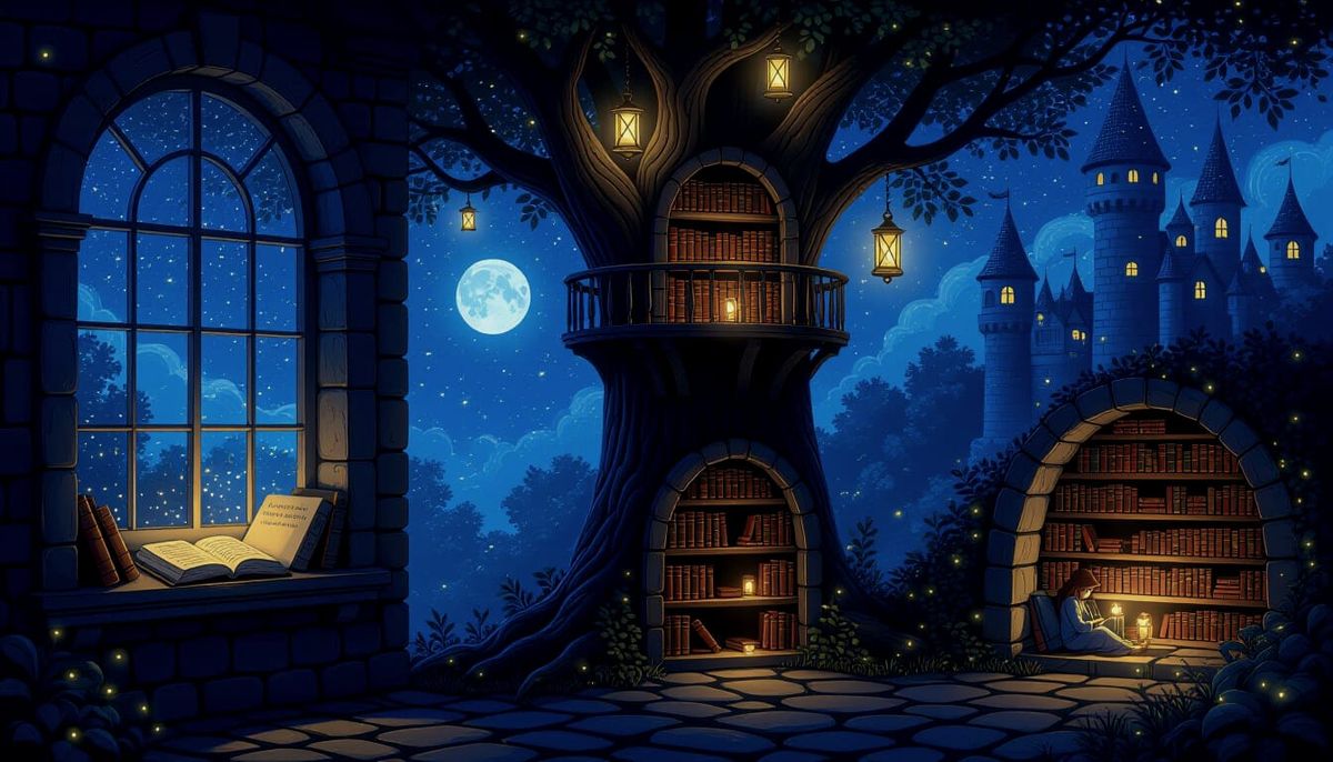 “A series of magical nighttime cozy reading nooks, glowing softly with enchantment: a window seat under a star-filled sky, moonlight streami...