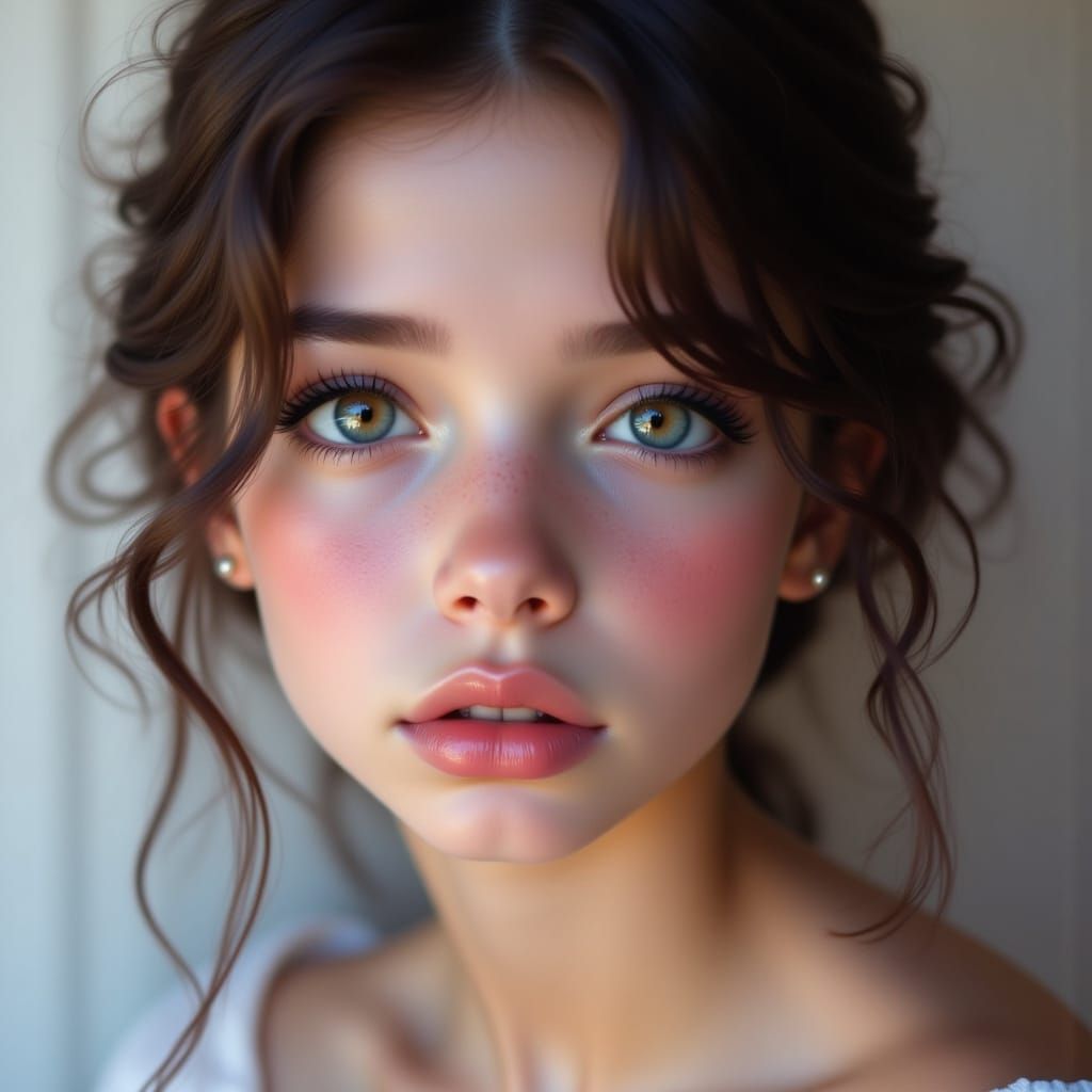 This image shows a hyperrealistic, soft-focus portrait of a young girl with dramatic makeup and striking eyes. Ethereal pastel lighting creates a dreamy, bokeh-rich background, captured with high-resolution cinematic detail.
