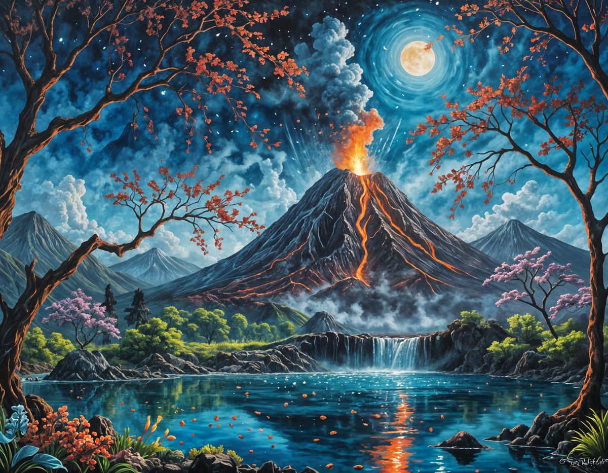 This image shows a stunning underwater volcano scene at night, set against a nebula sky with a glorious moonrise over a tall mountain, complete with a UV glowing waterfall and cherry tree branches in the foreground.
