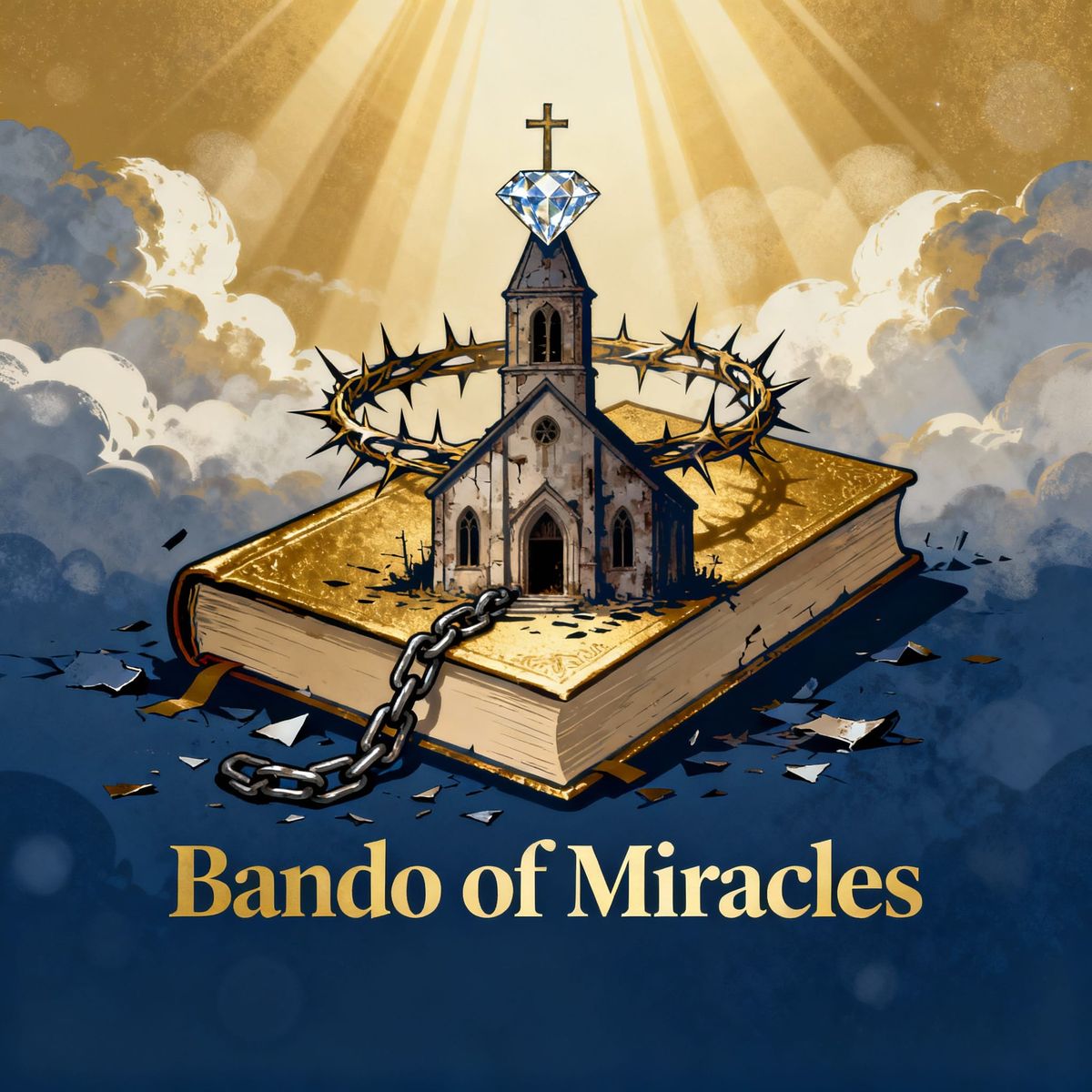 A clean vector logo for 'Bando of Miracles' featuring a divine abandoned church, golden bible, and shattered chains with a diamond thorn crown. Ethereal gold and blue tones evoke hope.