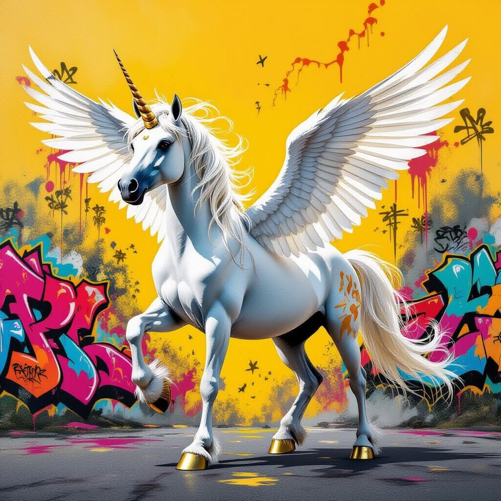 This image features a majestic alicorn with golden hooves, white wings, and a golden horn on a vibrant yellow background. The artwork showcases a dynamic graffiti and street art style with melting textures and rich colors.
