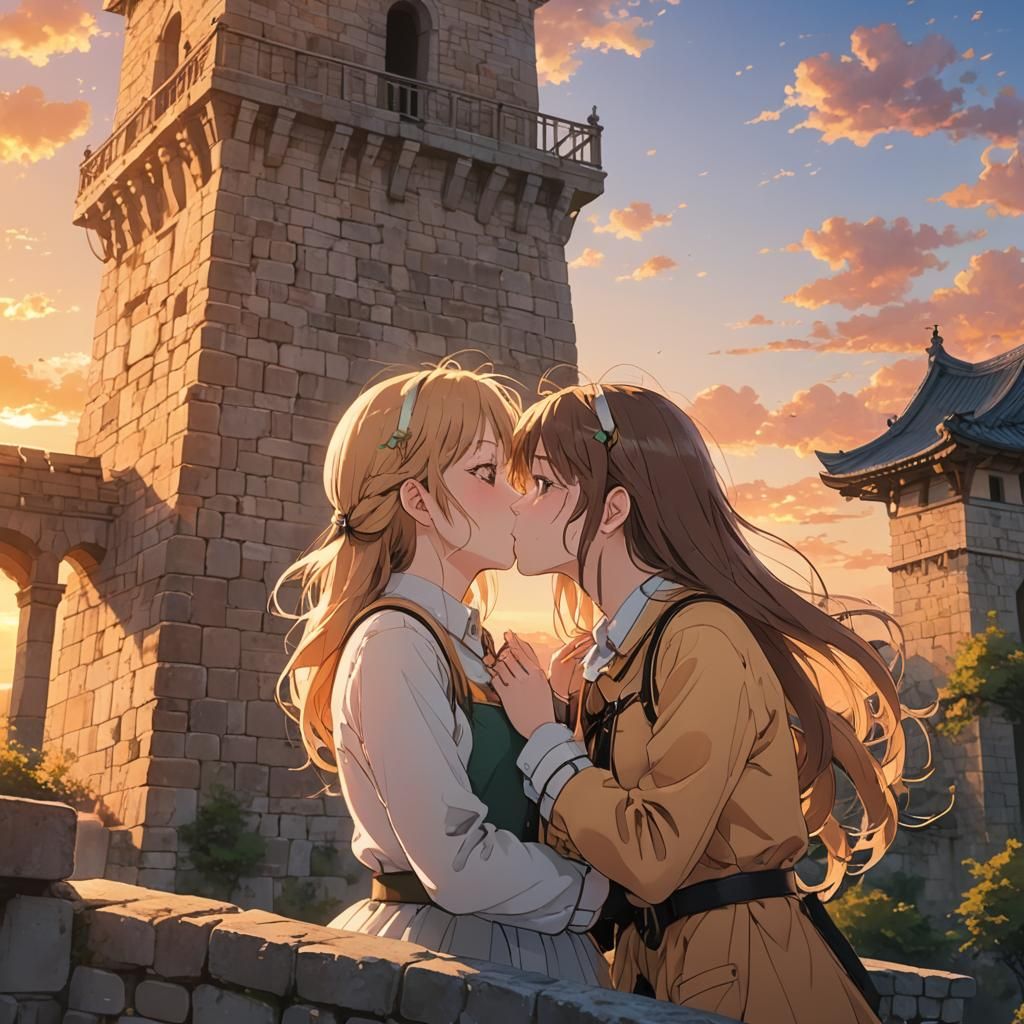 This image shows two anime-style girls kissing on a tower during sunset. The digital painting features soft shading, gentle lighting, and warm colors, creating a dreamy and expressive atmosphere.