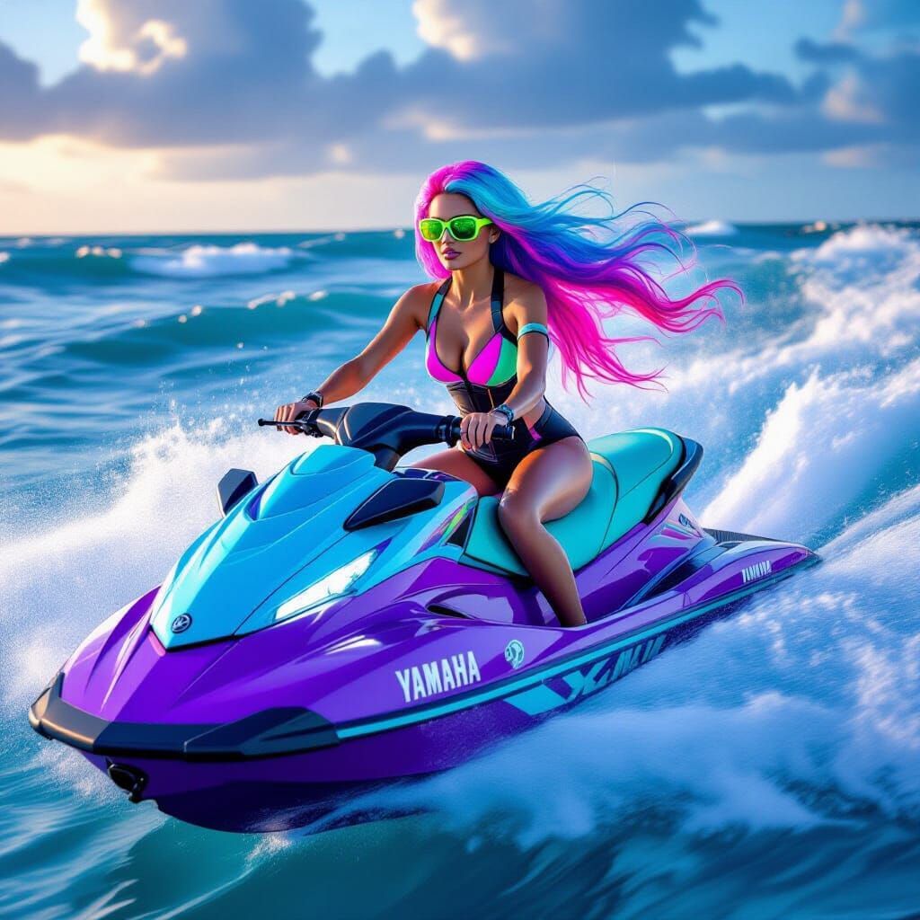 This action shot features a tall woman with vibrant, multicolored hair and neon green eyes confidently riding a bright purple jet ski across dynamic ocean waves. Dramatic lighting enhances the vivid colors.