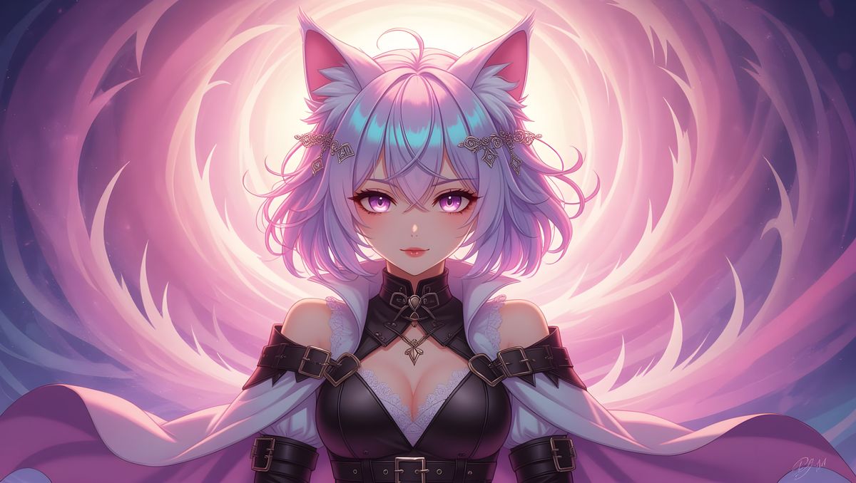 This image features an anime-style catgirl with striking purple eyes and stylish fantasy clothes, set against a detailed atmospheric background in a digital illustration, blending vibrant colors and ethereal qualities.