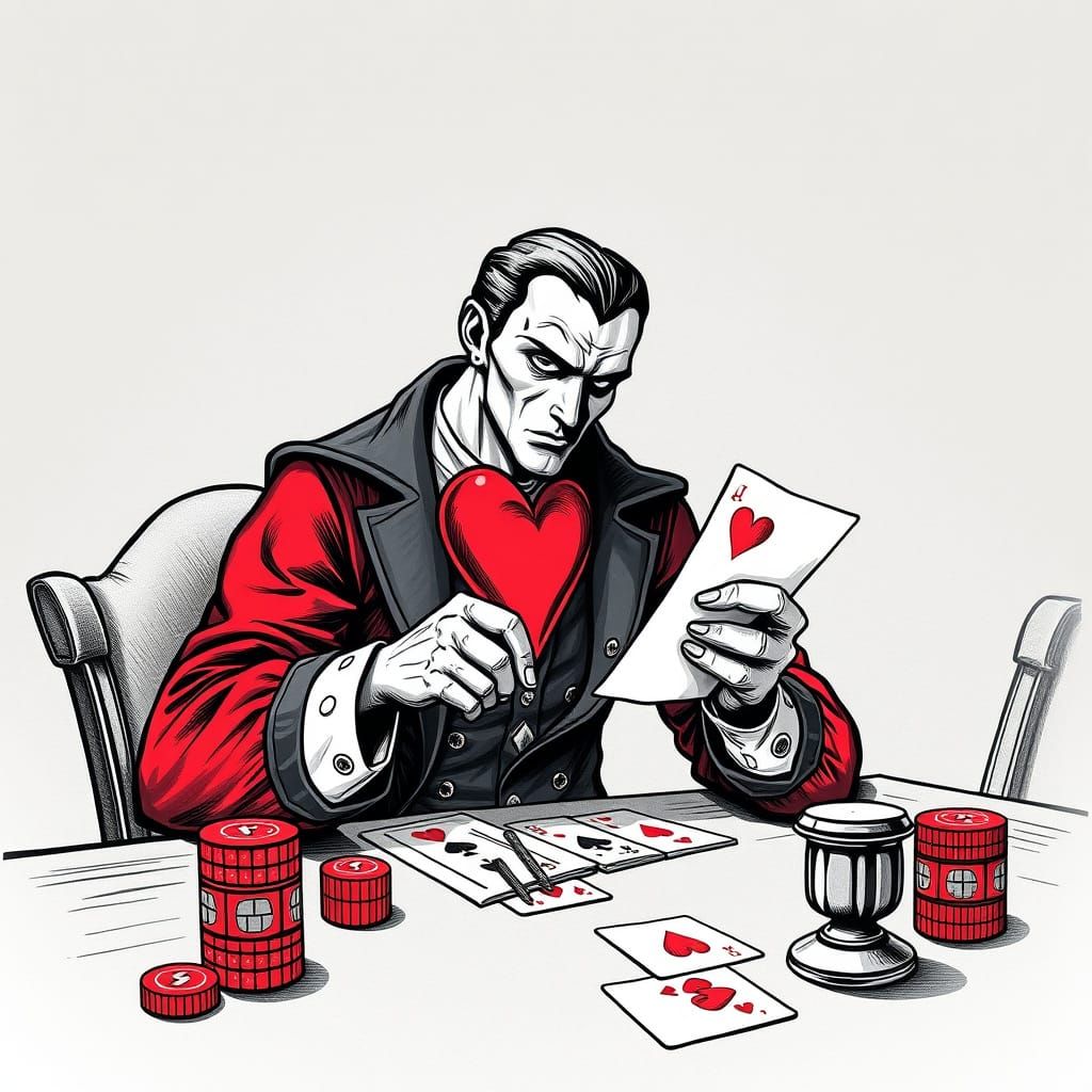This image shows the Jack of Hearts playing poker, depicted in a comic book style engraving. The artwork evokes vintage illustration.