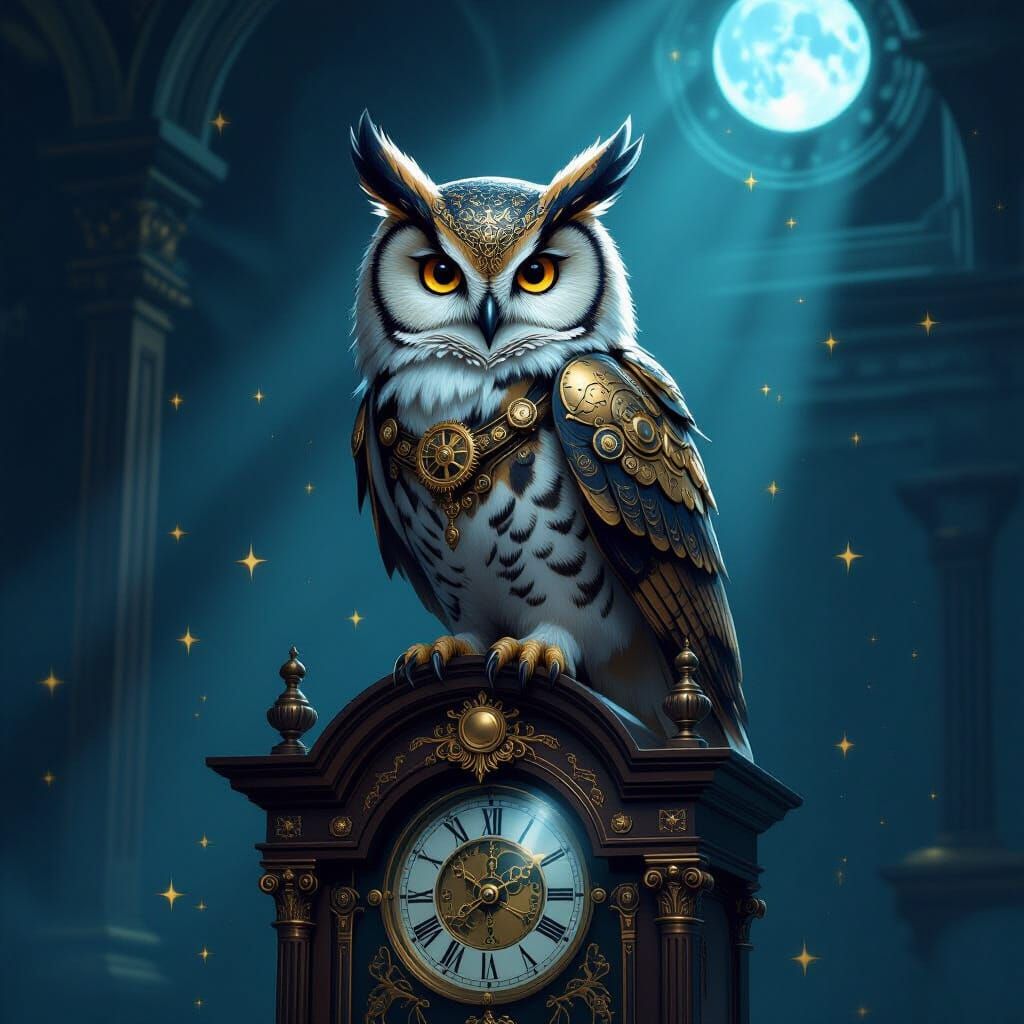 This image shows a detailed steampunk owl with clockwork gears on an ornate grandfather clock. The scene is set in a dimly lit Victorian study with atmospheric moonlight, rendered in an anime and mechanical illustration style.