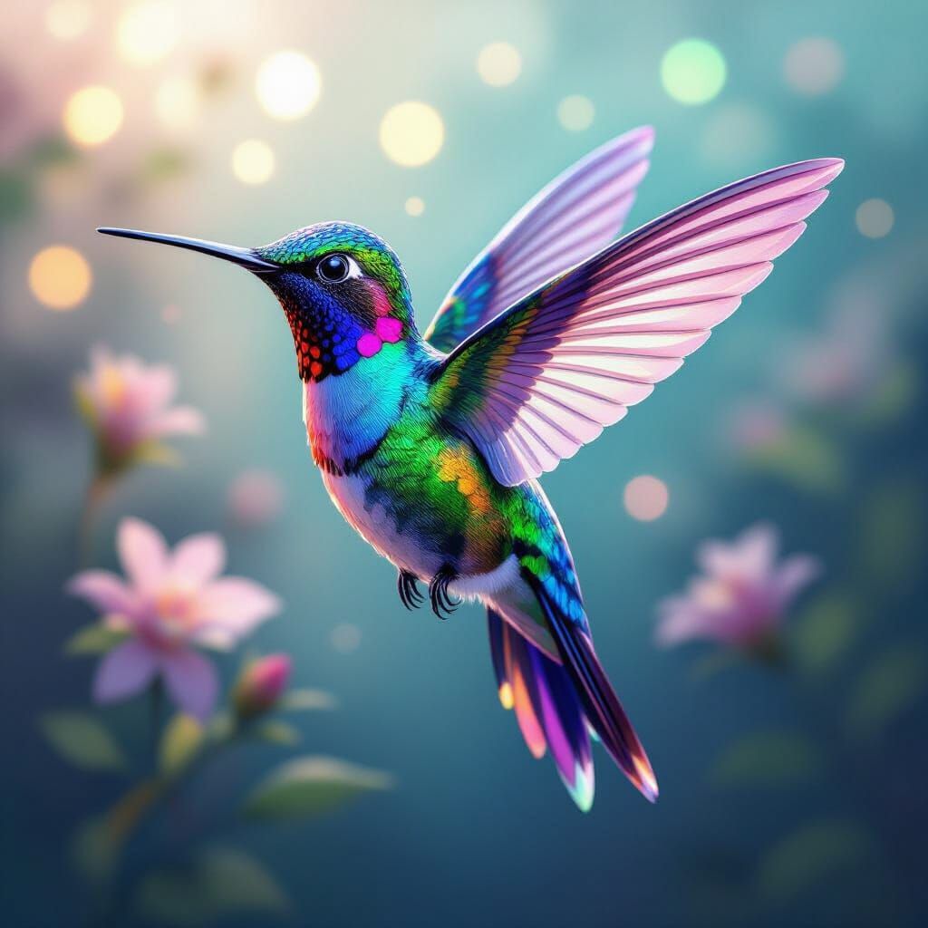 A striking picture of a hummingbird formed from prism crystal, displaying extraordinary colors. The iridescent feathers and delicate wings create a mesmerizing, dreamlike effect, reminiscent of digital art.