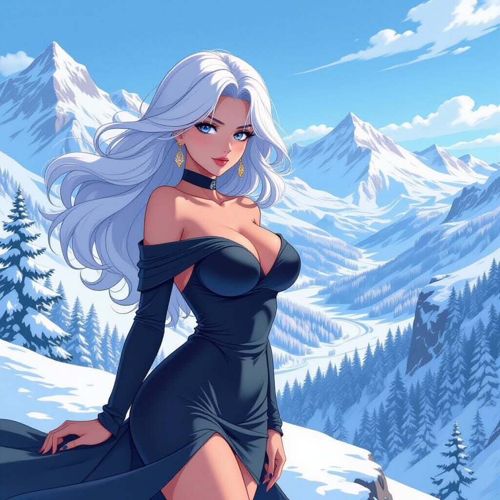This image features a striking anime-style pin-up of a woman with white hair on a snowy cliff. The art style uses bold outlines and cell-shading for a dynamic, dramatic look.