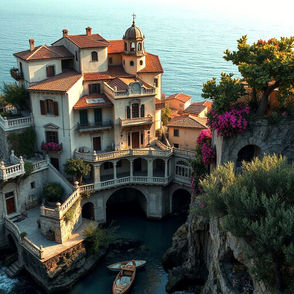 A stunning bird's eye view of a Romanesque town perched on seaside cliffs. The architecture features luxurious balconies, climbing roses, and vibrant colors, rendered with dynamic lighting and intricate detail.
