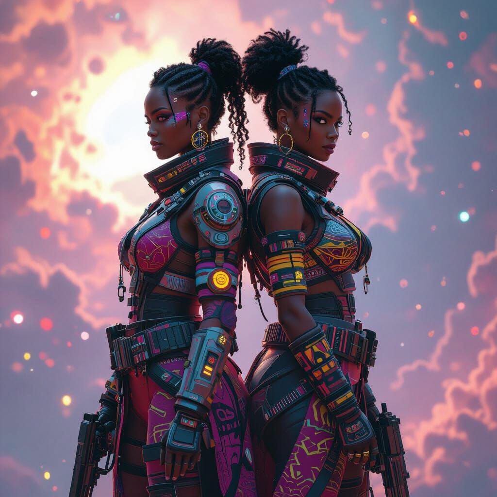 This image shows three powerful space pirate sisters in futuristic tribal garments, poised for battle. The full shot composition, set against a swirling nebula, features dynamic lighting and intricate textures as digital art.