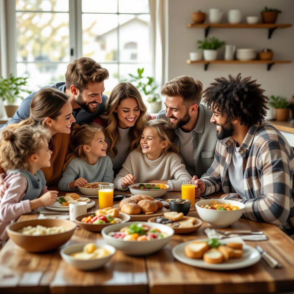 This image shows a family enjoying a colorful, balanced meal featuring low-glycemic foods, perfect for a Glycemic Index Diet feature. Natural light highlights the vibrant ingredients and happy atmosphere.