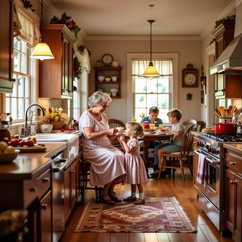 Easily generate images of cozy kitchens and family gatherings with our free AI image generator.