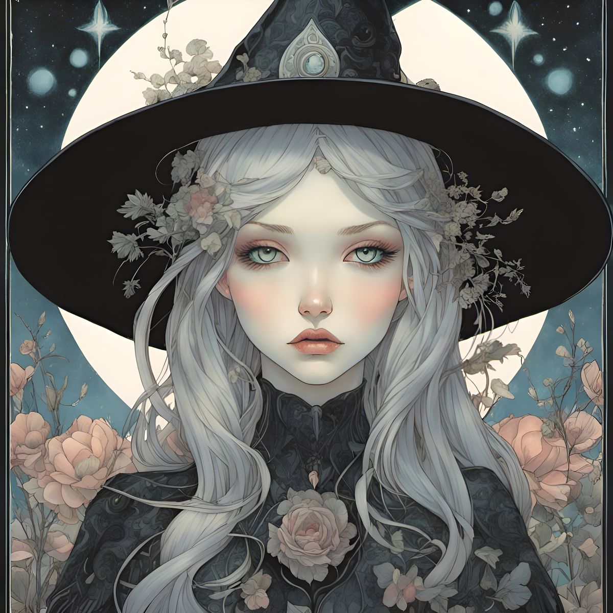 Pouty witch girl by Miho Hirano, Amanda Sage and Android Jones in art brut style; dark but soft; moody but cute