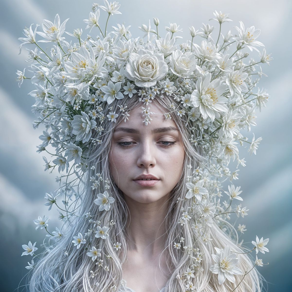A striking picture of a person with a floral headdress seamlessly blended into their hair. The portrait is rendered with hyperrealistic detail, showing intricate textures and soft shadows in a dreamlike and serene style.