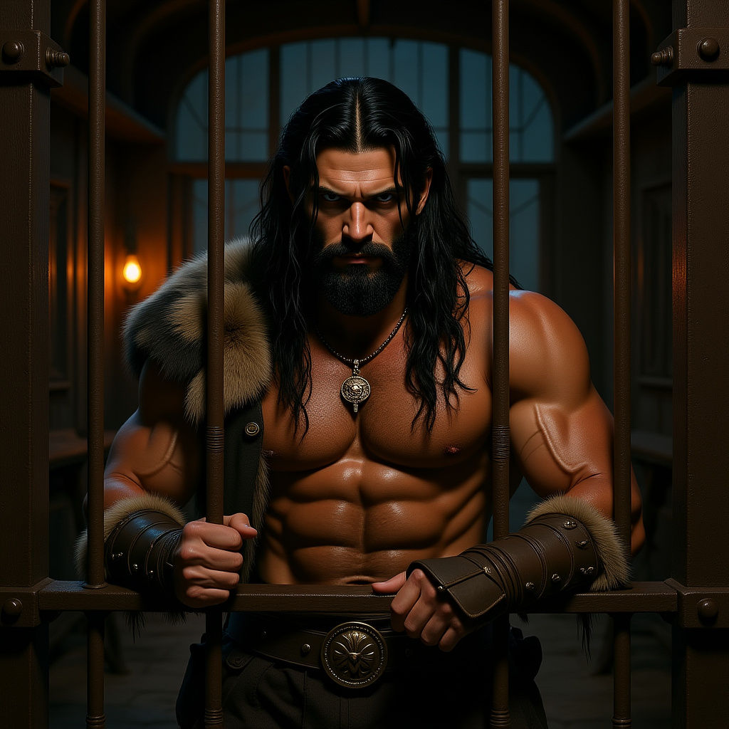 This image depicts a strong, attractive man with long dark hair and blue eyes. He is dressed in tattered clothing and animal skins, held captive in a cage at a nighttime carnival.