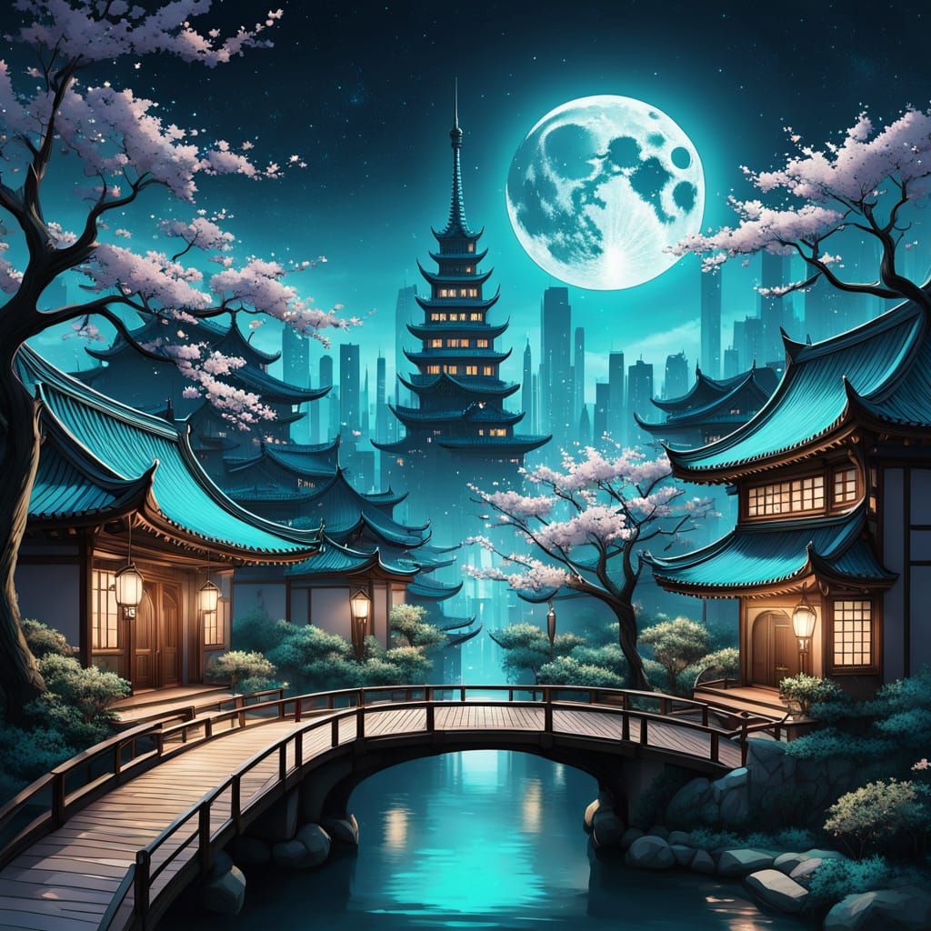 Turquoise art. Create a nighttime turquoise futuristic cityscape called "Sakura Spire 5112" with dark towering structures illuminated by soft turquoise moonlight. The scene consists of dense buildings with luminous windows, intertwined with cherry blossom trees, which add a piece of nature to the urban ...