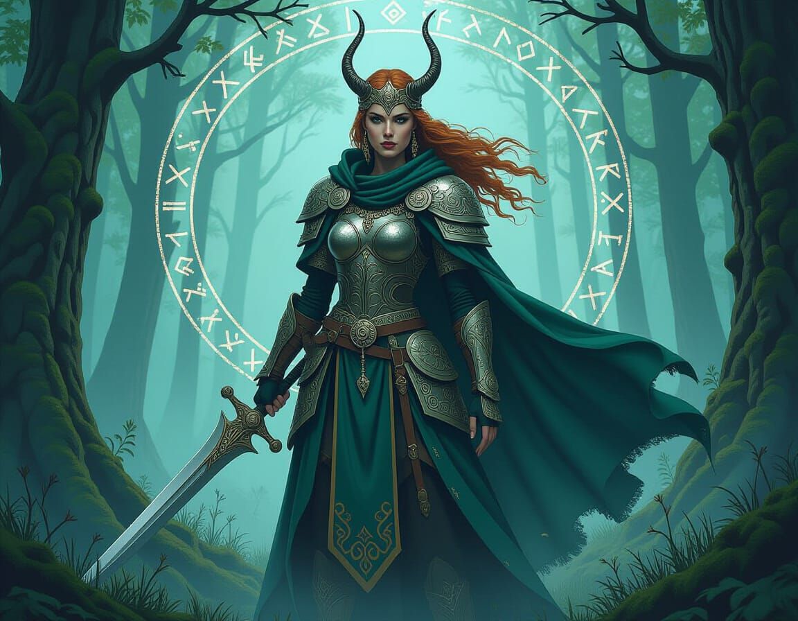 This image shows a Norse goddess in ornate armor standing in a mystical forest. The scene features atmospheric lighting and intricate details, rendered with a Brian Froud-esque aesthetic.