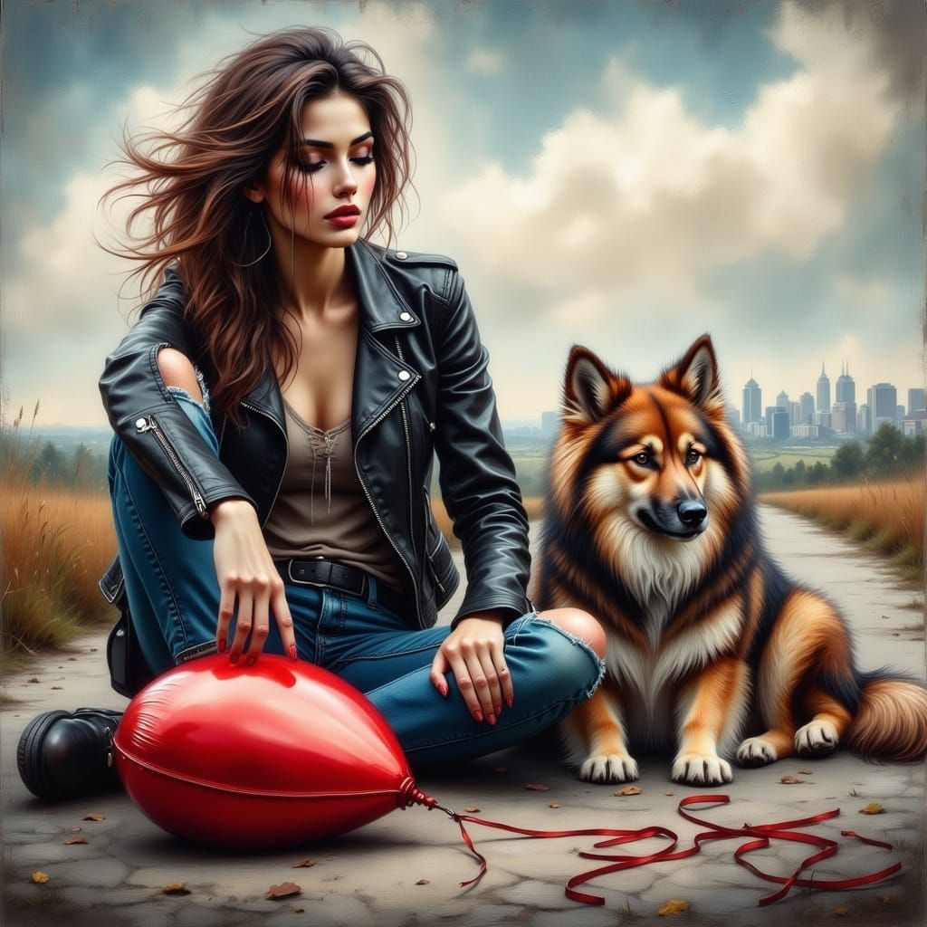 A poignant image of a Harley-riding woman gazing at a deflated heart-shaped balloon, her loyal dog by her side, in a highly detailed, photorealistic style reminiscent of cinematic still frames.