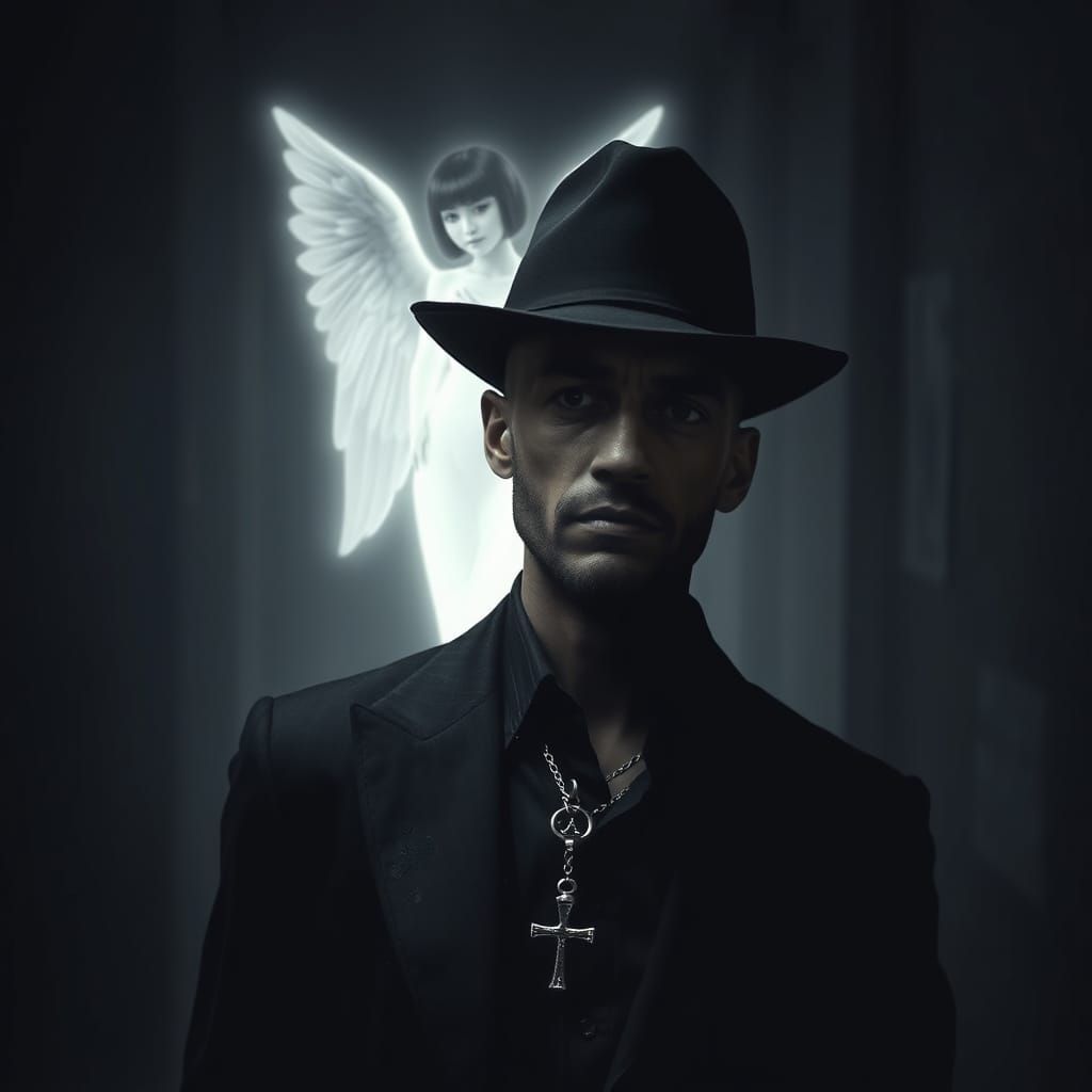 This haunting image depicts a lone figure in a dimly lit alley, surrounded by shadows, yet illuminated by the soft glow of an ethereal female angel. Inspired by moody, atmospheric art, the muted color palette evokes a sense of melancholic introspection and contemplative longing.