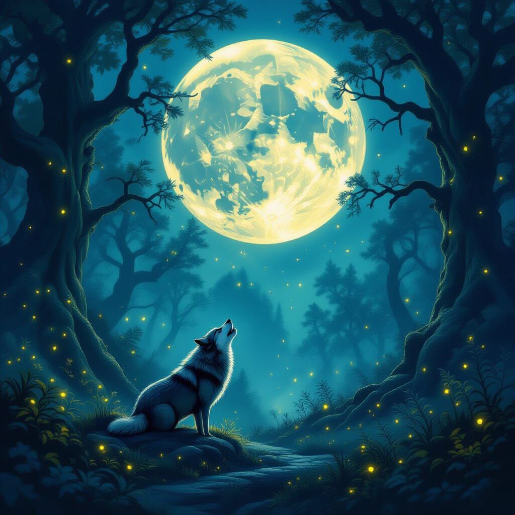 A lone wolf howls at a giant, glowing moon in a mystical forest. Fireflies surround ancient trees, with hidden fae revealed by moonlight. Rendered in a rich, painterly fantasy concept art style.