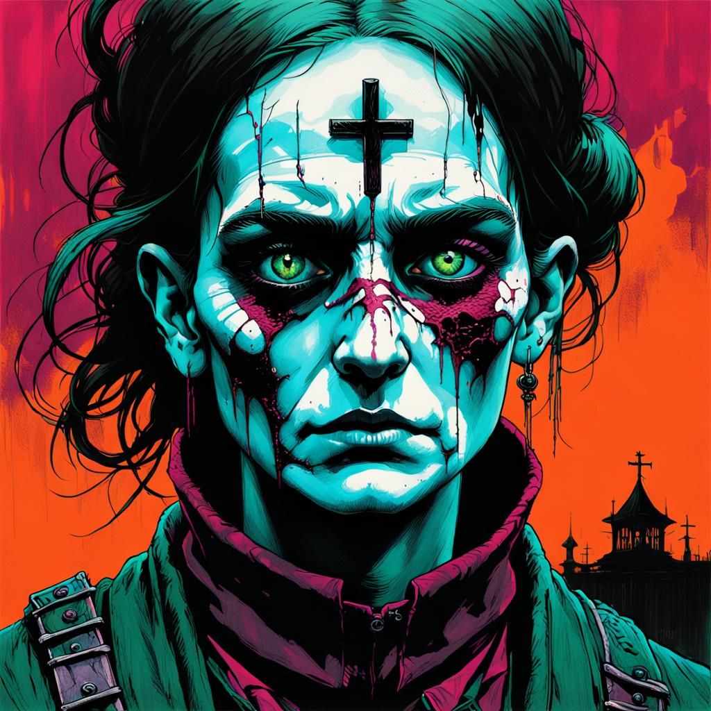 This image shows a gothic scene blending romanticism with glitchcore elements. The artwork features a mix of deep, contrasting colors in a hyperrealistic style reminiscent of film noir and art nouveau.