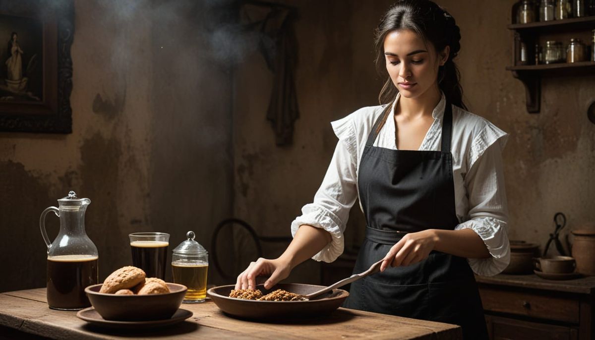 This image shows a 17th-century oil painting of a housewife preparing breakfast. The artwork employs chiaroscuro techniques, a sfumato effect, and a glossy varnish finish to highlight the textures and light.
