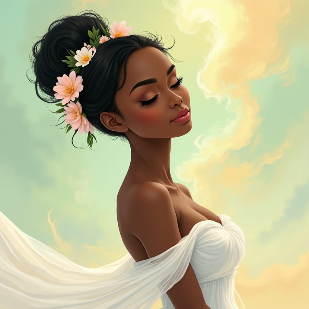 A serene image of a Black woman with a high puff hairstyle decorated with pastel flowers. She wears a flowing white gown against a dreamy pastel background, rendered with impressionistic brushstrokes.
