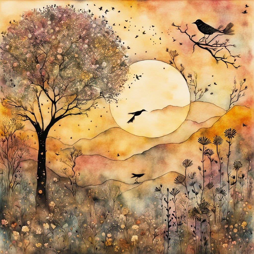 A watercolour and ink painting of a lone figure in a flower garden at sunset. The image has a distressed texture and inky outlines, creating an idyllic and atmospheric scene in muted colours.