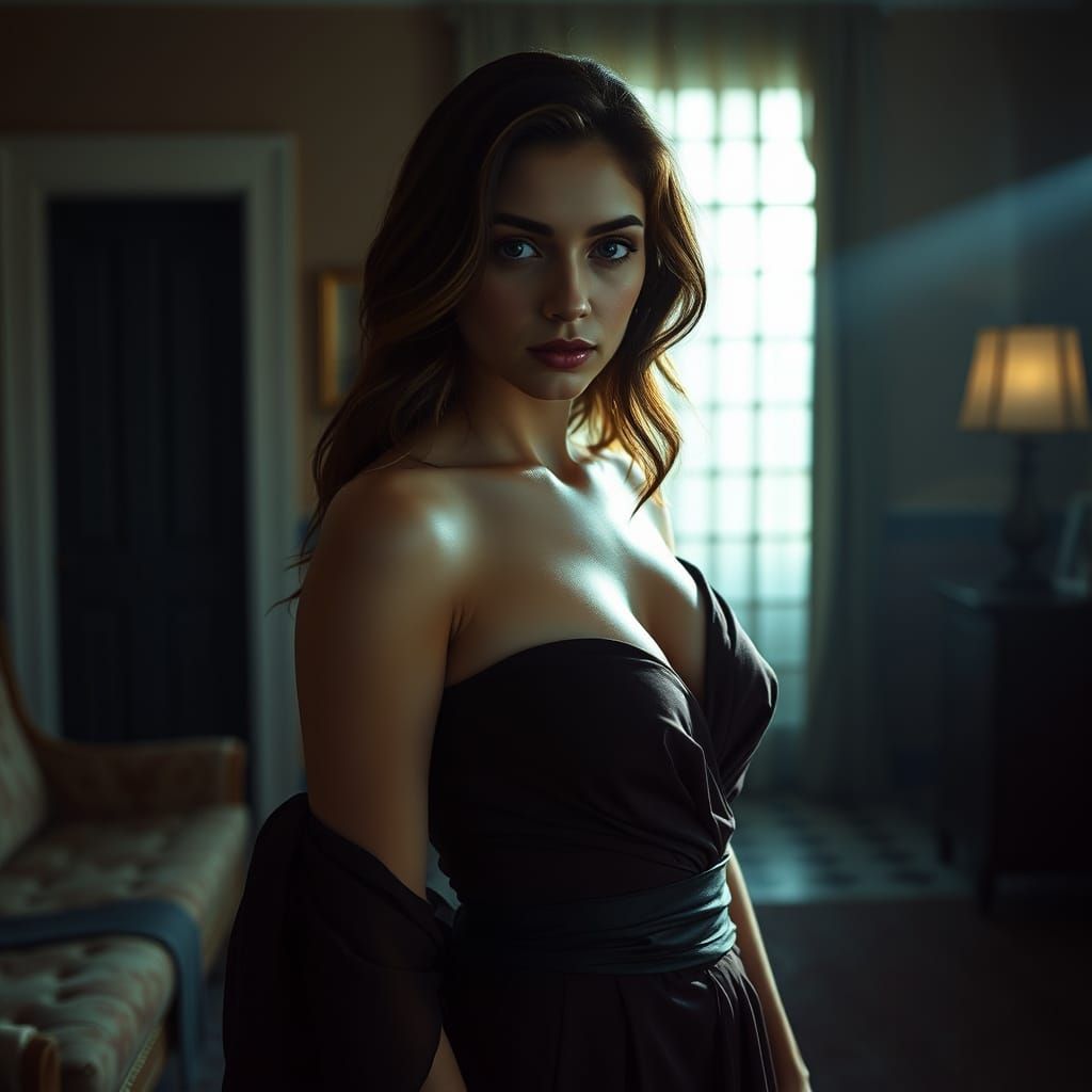 A hyperrealistic image of a beautiful young woman in elegant clothing, set in a dramatically lit room. The artwork evokes cinematic stills with vibrant colors and epic atmosphere, reminiscent of 35mm film.