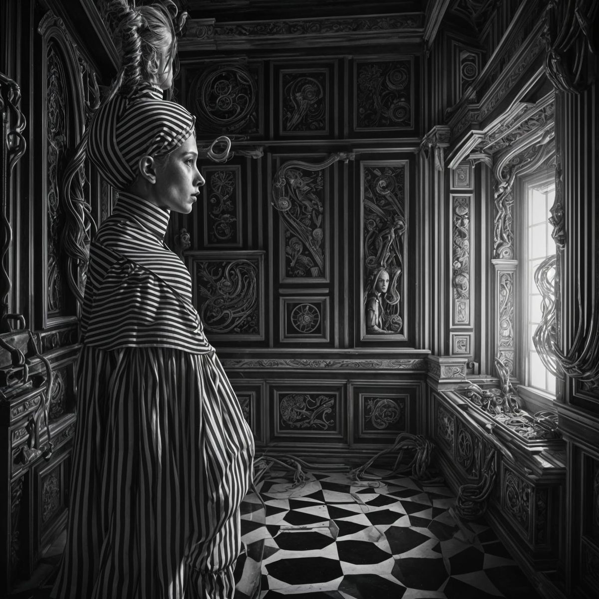 A woman stands frozen in a seemingly endless labyrinth of black and white stripes, surrounded by distorted tablecloths and tattered curtains that writhe and twist around her. The atmosphere is eerie and unsettling, with bold, vibrant colors and textures that evoke a sense of unease and discomfort.
