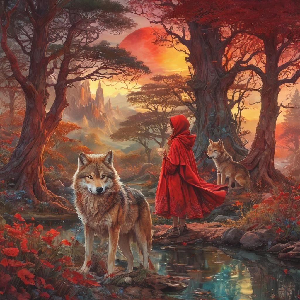 Best quality, Spiriling Double exposure close up red riding hood and wolf Digital watercolor Illustration of a landscape sunset, Fantasycore Stylized splashy Watercolor by Waterhouse, Josephine Wall, WLOP, chaotic cinematic detail and rich colors, various colors and shades, Vibrant and deep quality, ...