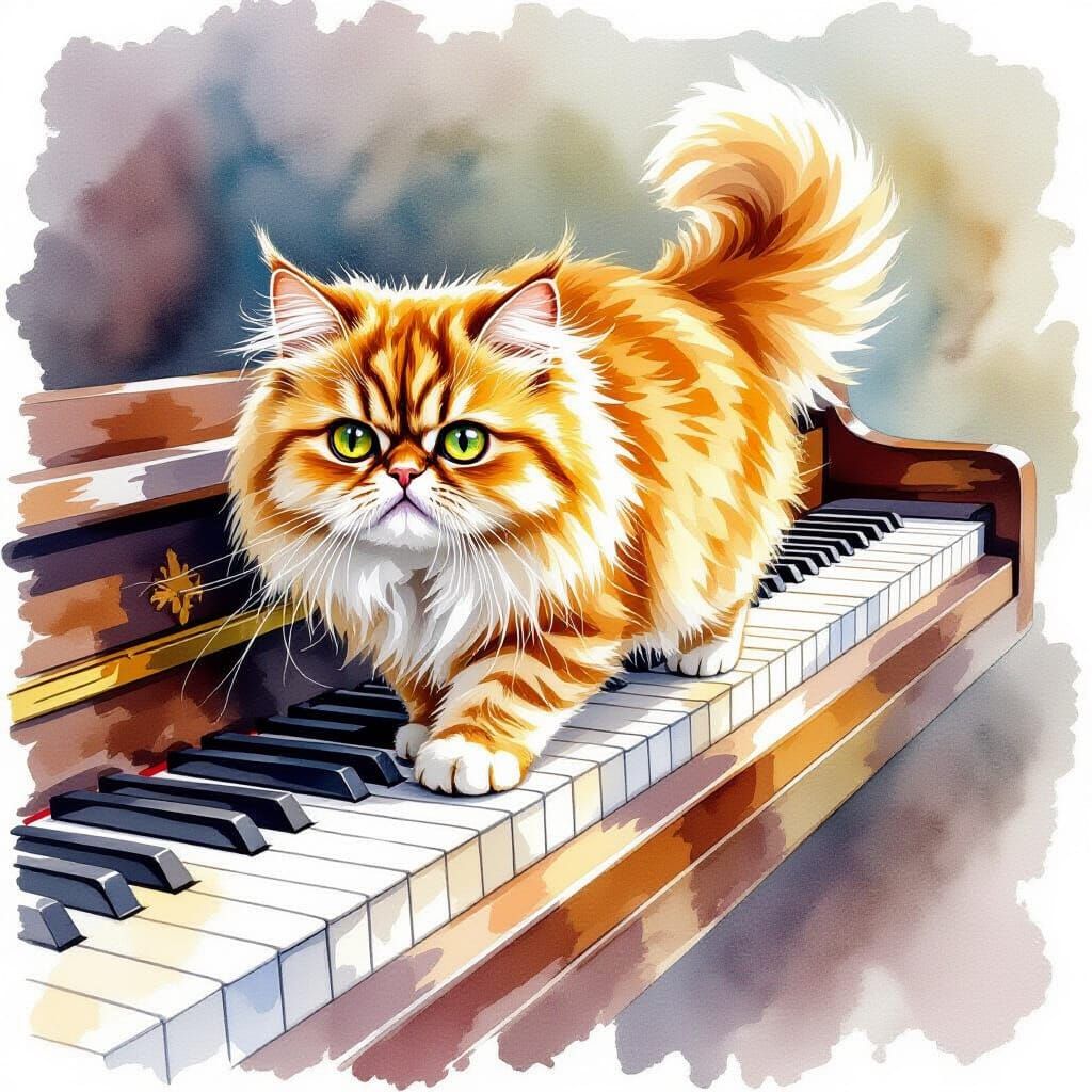 This image depicts a golden Persian cat walking on piano keys in a realistic watercolor style. The artwork captures the fluid and expressive nature of watercolors.