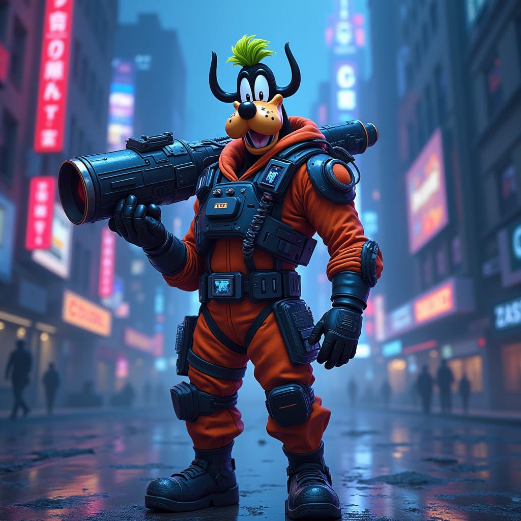 This image depicts a wacky yet fearsome vigilante in a high-tech, cyberpunk combat suit, standing heroically in a dystopian cityscape with electric blues and purples hues, surrounded by skyscrapers and gritty streets.