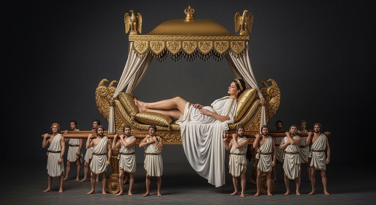 This image shows a Roman Empress reclining on a golden litter, attended by servants. The scene evokes classical paintings with a focus on luxurious details, soft lighting, and a shallow depth of field.
