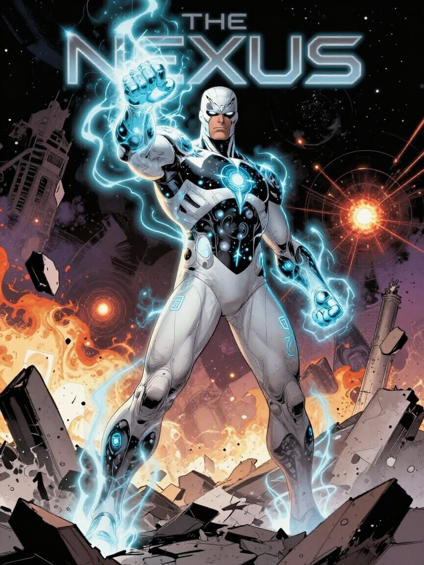 This image shows The Nexus on a shattered battlefield, cosmic energy flowing from his fist. The art style is reminiscent of classic comic book covers with dynamic composition and cinematic lighting.