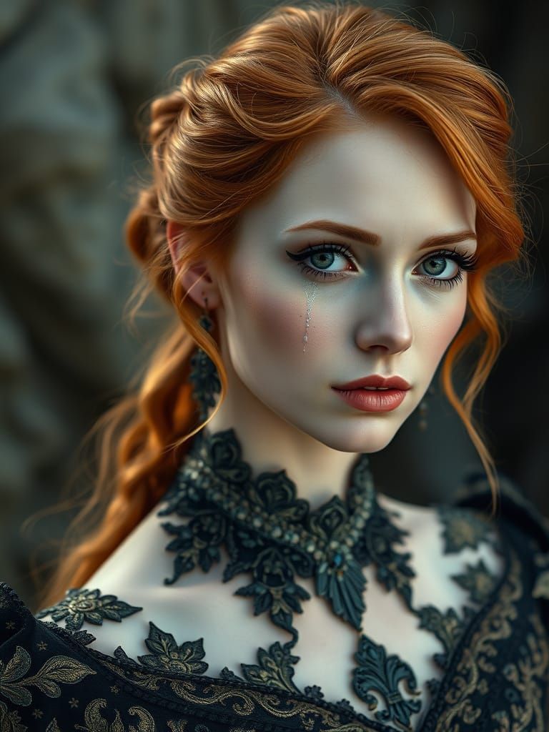 This image depicts a sorrowful woman with a painted tear. She has ginger hair, green eyes, and is adorned with earrings, wearing a beautifully tailored dress.