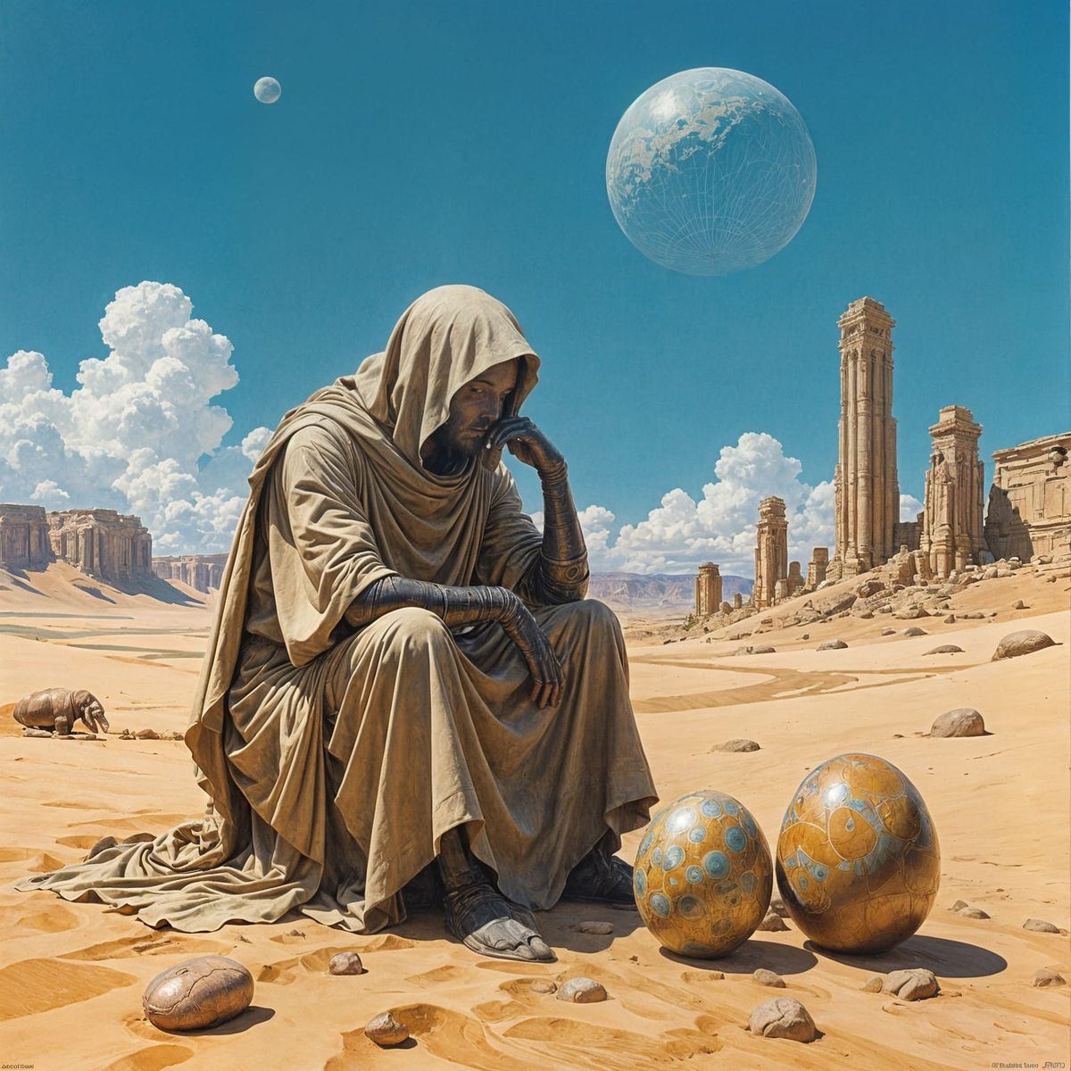 This image shows an old man sitting in a desert next to two dinosaur eggs. The background depicts an alien landscape with ruins, rendered as an art nouveau painting.