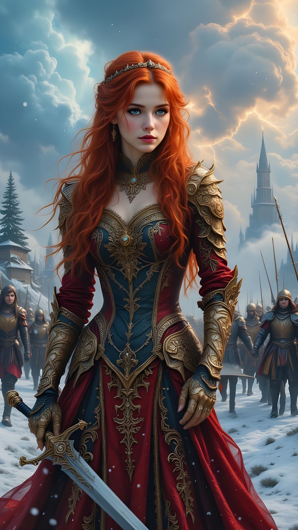 A striking image shows a red-haired warrior queen leading her army across a snowy battlefield. The scene, reminiscent of epic fantasy art, uses dynamic lighting, cool blues, and fiery reds to convey power.