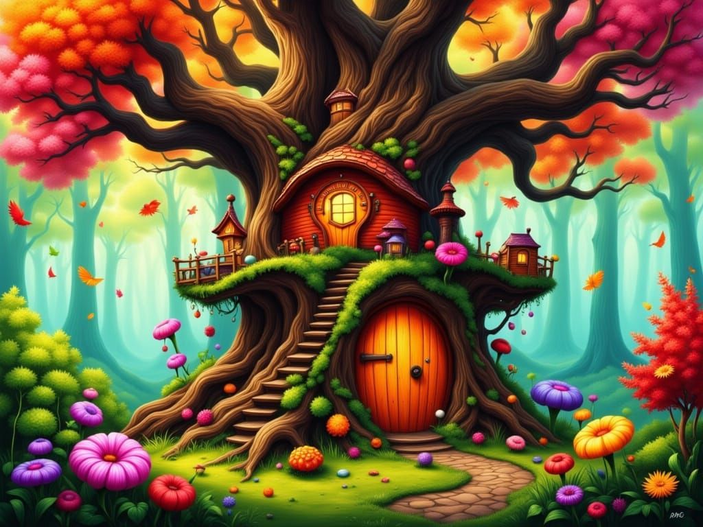 This enchanting image depicts a fantastical treehouse nestled in a whimsical fairy land, surrounded by a kaleidoscope of colorful leaves and vibrant, playful colors, evoking a sense of wonder and magic reminiscent of a fairycore art style.