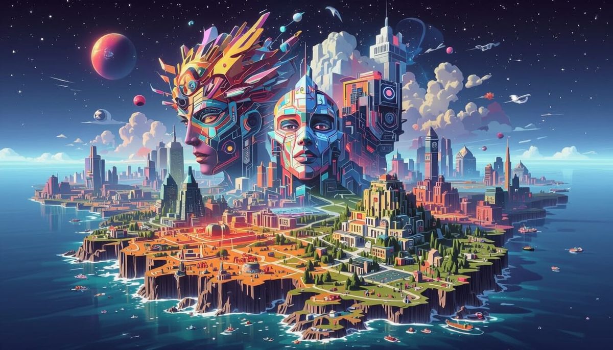 Aerial view of a lively NFT city with glowing buildings and streets. Features a surreal, cubist, and futuristic 3D aesthetic.
