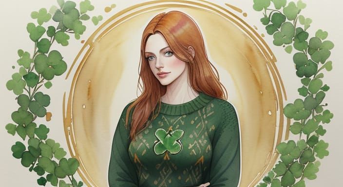 A digital watercolor of a red-haired woman in an Irish sweater, surrounded by shamrocks. The portrait features a golden hour effect and bokeh in an ethereal style.