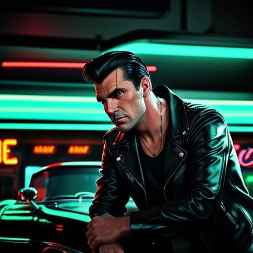 This image shows a greaser in a leather jacket leaning against a vintage car. The scene, bathed in warm cinematic light, evokes a film noir style with a nostalgic diner backdrop.