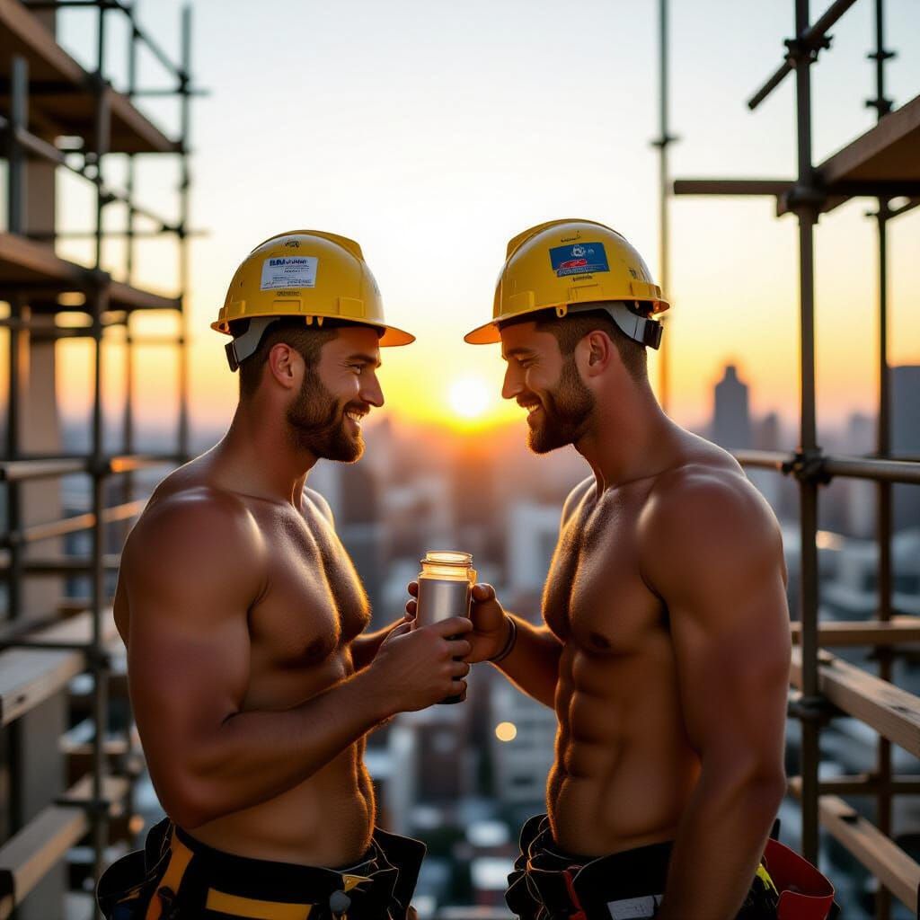This photorealistic image captures two shirtless construction workers sharing a canteen on a high-rise at golden hour. Cinematic composition and volumetric lighting highlight their strength and bond.