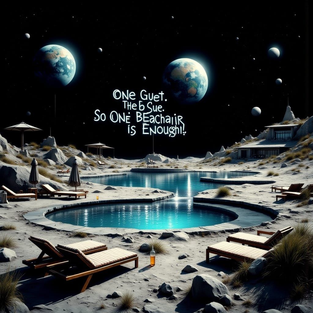 A surreal moon resort with an extravagant bar and pool, set against a black background. The artwork features cosmic cocktails and floating lounge chairs in a digital art style.