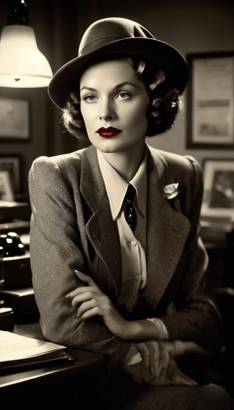 This image shows a 1930s female detective in her office. The scene features a film noir aesthetic, with high contrast lighting, a smoky atmosphere and sepia toned photorealism.