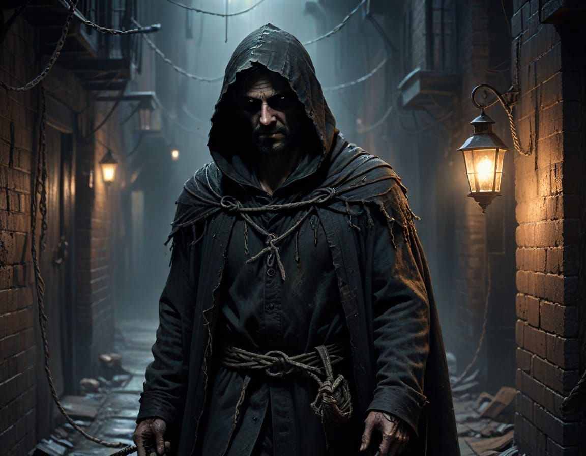 This image shows a shadowy hangman in a dimly lit alley, illuminated by moody lantern light. The figure wears a tattered black cloak in this dark fantasy oil painting.