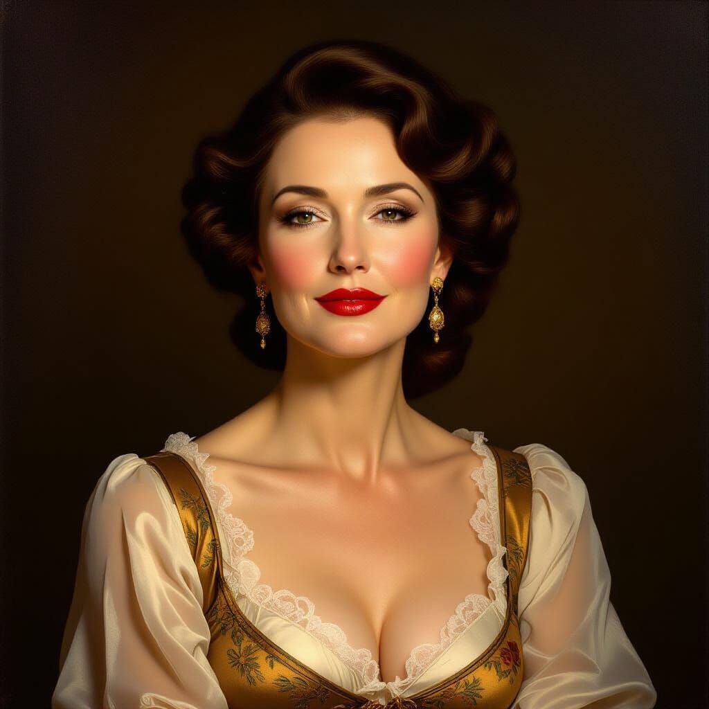 A captivating portrait of a confident mature woman with perfect skin and red lips, wearing a semi-transparent blouse. The image is rendered with impasto textures and jewel-toned colors reminiscent of classic paintings.