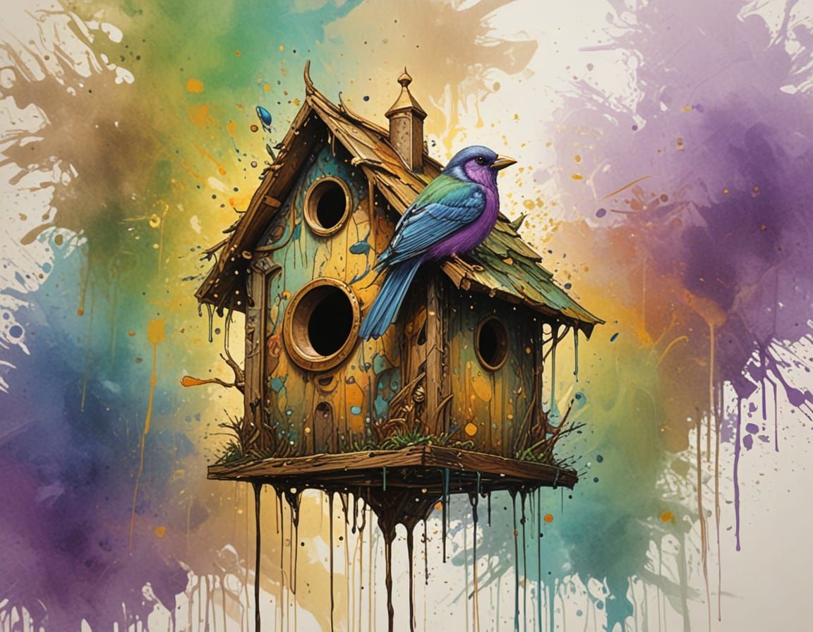 A detailed splash art image featuring a birdhouse on a branch, rendered with dripping watercolor and graffiti elements. Illuminated by vibrant purple, blue, green, and gold light.